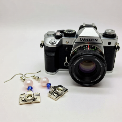 Camera with white and Blue Bead Earrings